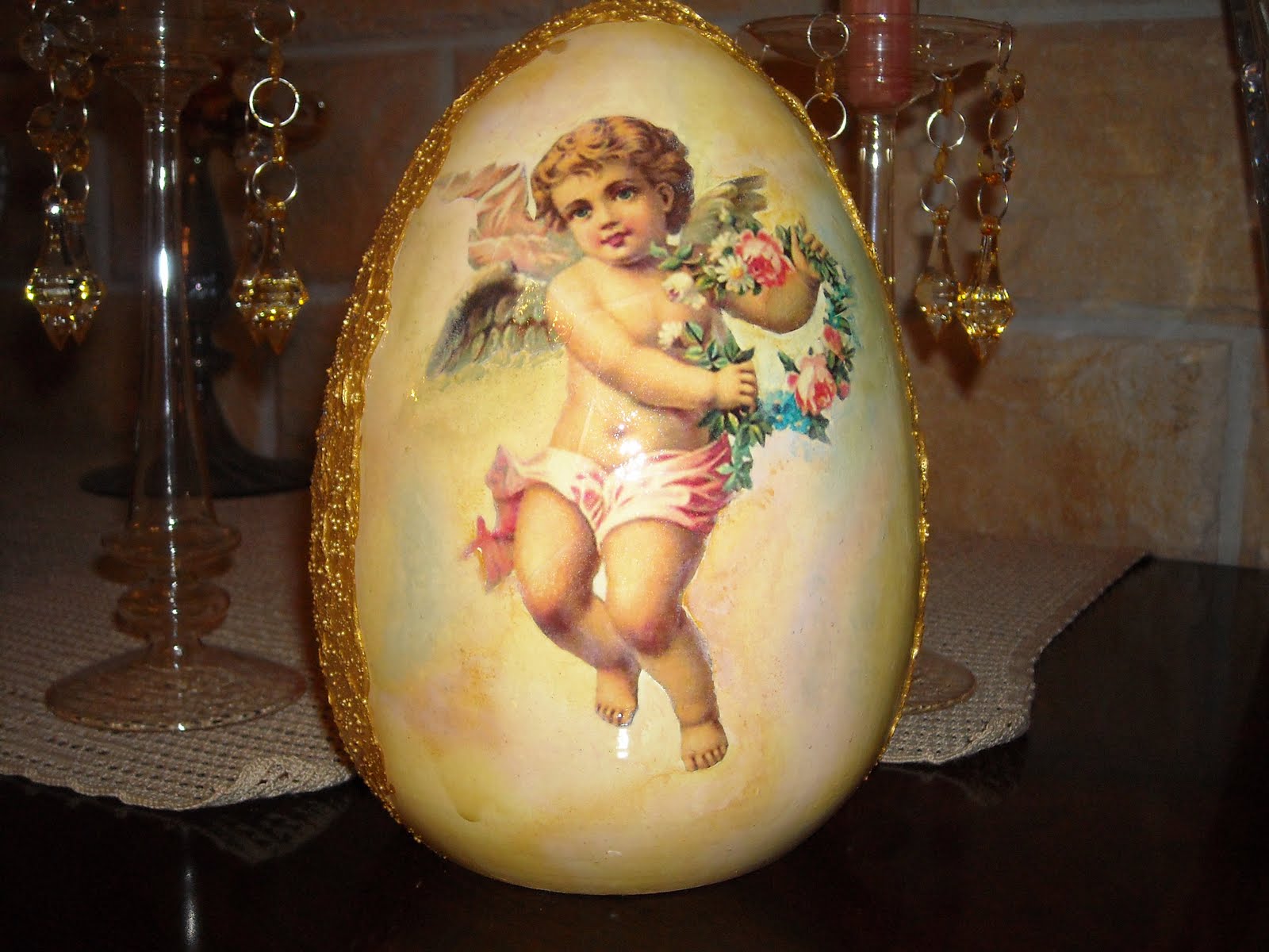 Uovo decorato con la tecnica del decoupage,l'ho sfumato con vari colori e infine gli ho applicato una pasta modellabile oro....per tutti quelli che amano questo Santo.